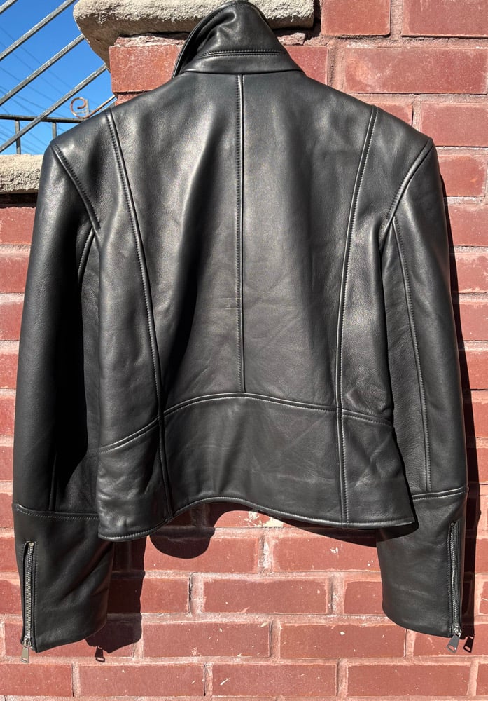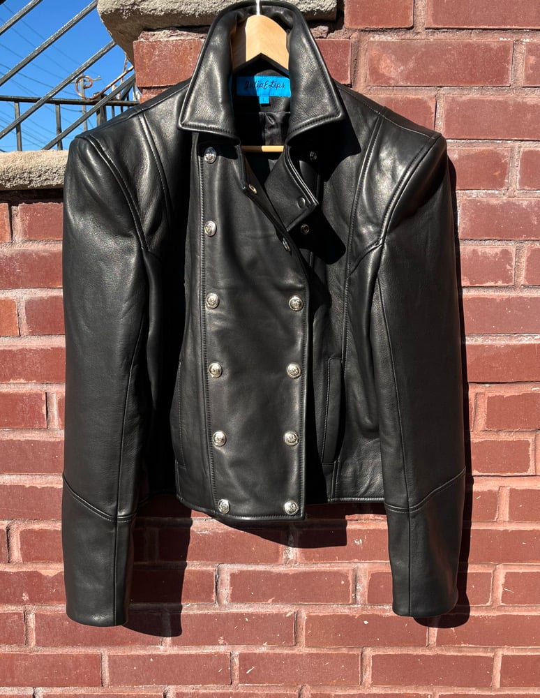 Military genuine buttery soft leather jacket. Great for spring and fall collections. This military style jacket has silver military buttons, side cuff zippers, 2-side pockets and padded shoulders and a stitched in detail that sets this jacket aside from the rest.